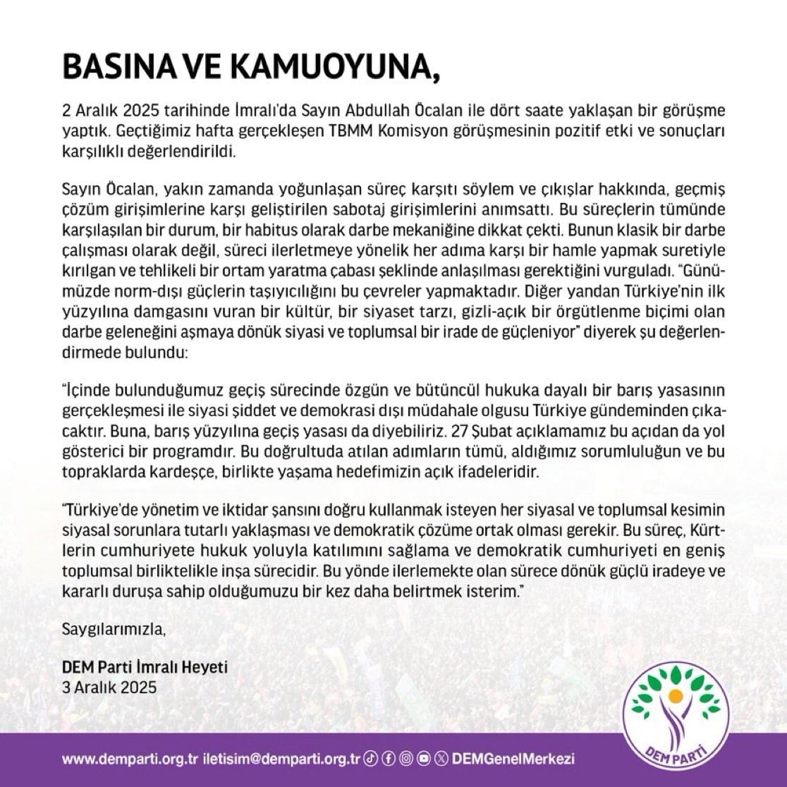 “2 Aralık 2025 tarihinde İmralı’da Abdullah Öcalan ile dört saate yaklaşan bir görüşme yaptık. Geçtiğimiz hafta gerçekleşen TBMM Komisyon görüşmesinin pozitif etki ve sonuçları karşılıklı değerlendirildi.