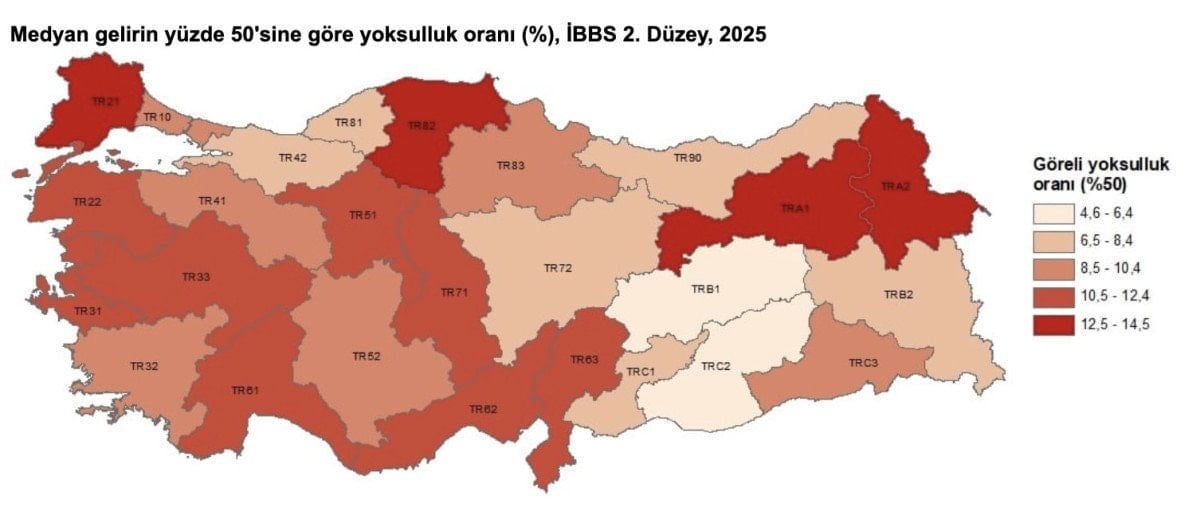 İBBS 2. Düzey bölgelerine göre yapılan yoksulluk analizine göre, gelire dayalı göreli yoksulluk oranının en yüksek olduğu bölgeler %14,5 ile TR21 (Tekirdağ, Edirne, Kırklareli) ve %14,3 ile TR82 (Kastamonu, Çankırı, Sinop) olarak açıklandı. En düşük oran ise %4,6 ile TRC2 (Şanlıurfa, Diyarbakır) bölgesinde kaydedilmiştir.
